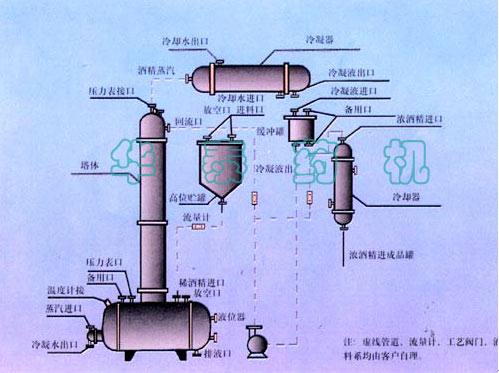 Purpose: This equipment adopts high efficient stainless steel corrugated fillings,all made of stainless steel in order to ensure the alcohol can’t be polluted.The tower adopts knock-down V style pipe,so it is convenient for heating ektexine and cleaning the wall wiall of the tower.The equipment adopts two styles of external and internal heating,the clients may choose it according to the pratical needs.